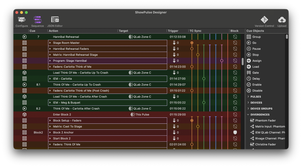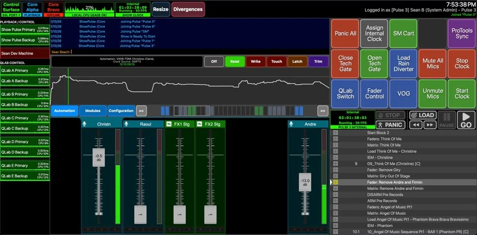 ShowPulse acts as a master control platform for immersive musical theater productions, able to coordinate elements such as mixing consoles and playback software via an extensive and dynamically adjustable set of parameters and instructions, a “digital conductor” of sorts. The program can seamlessly jump between different parts of a show in real time and can even run multiple instances of the production simultaneously without interfering with each other.